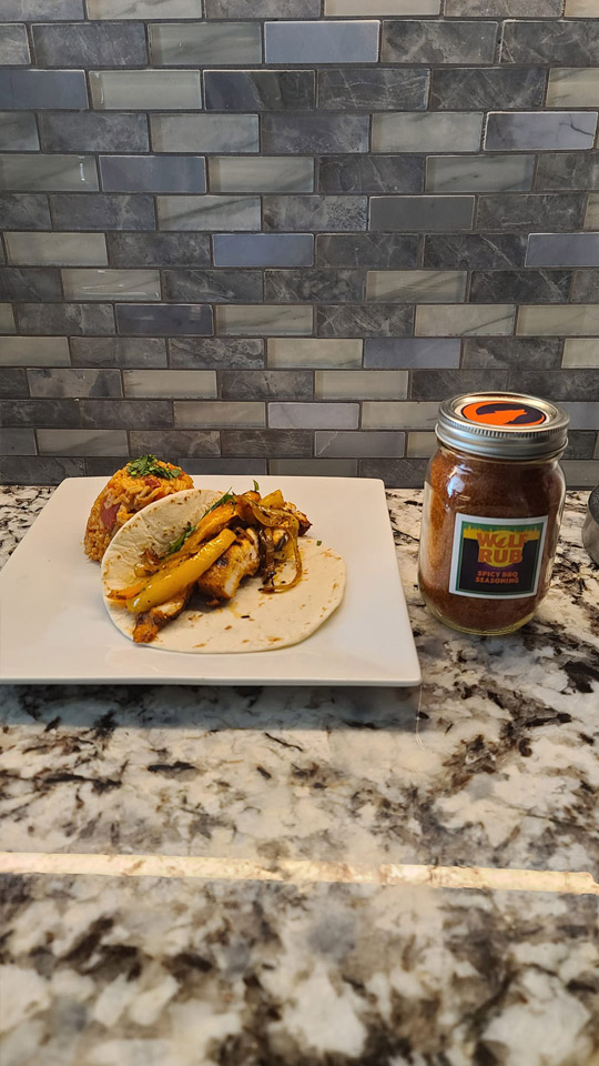 Tonight’s wolf rub recipe is a Wolf Rub marinara with chicken, shrimp, andouille, grilled onions and peppers on linguine