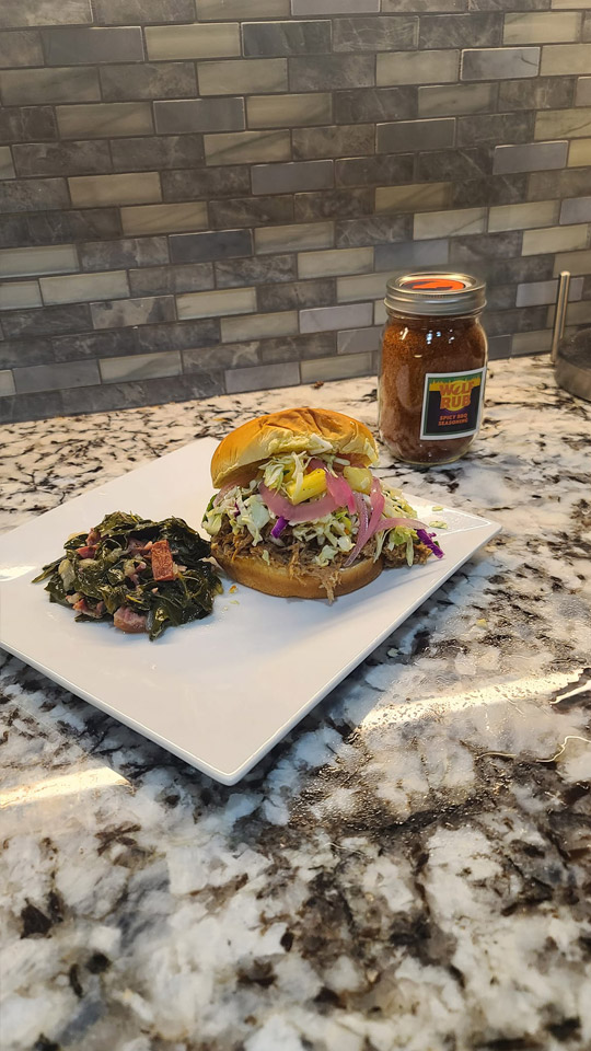 Diablo rubbed pulled pork sandwich, pineapple jalapeño coleslaw with braised collard greens #wolfrubs