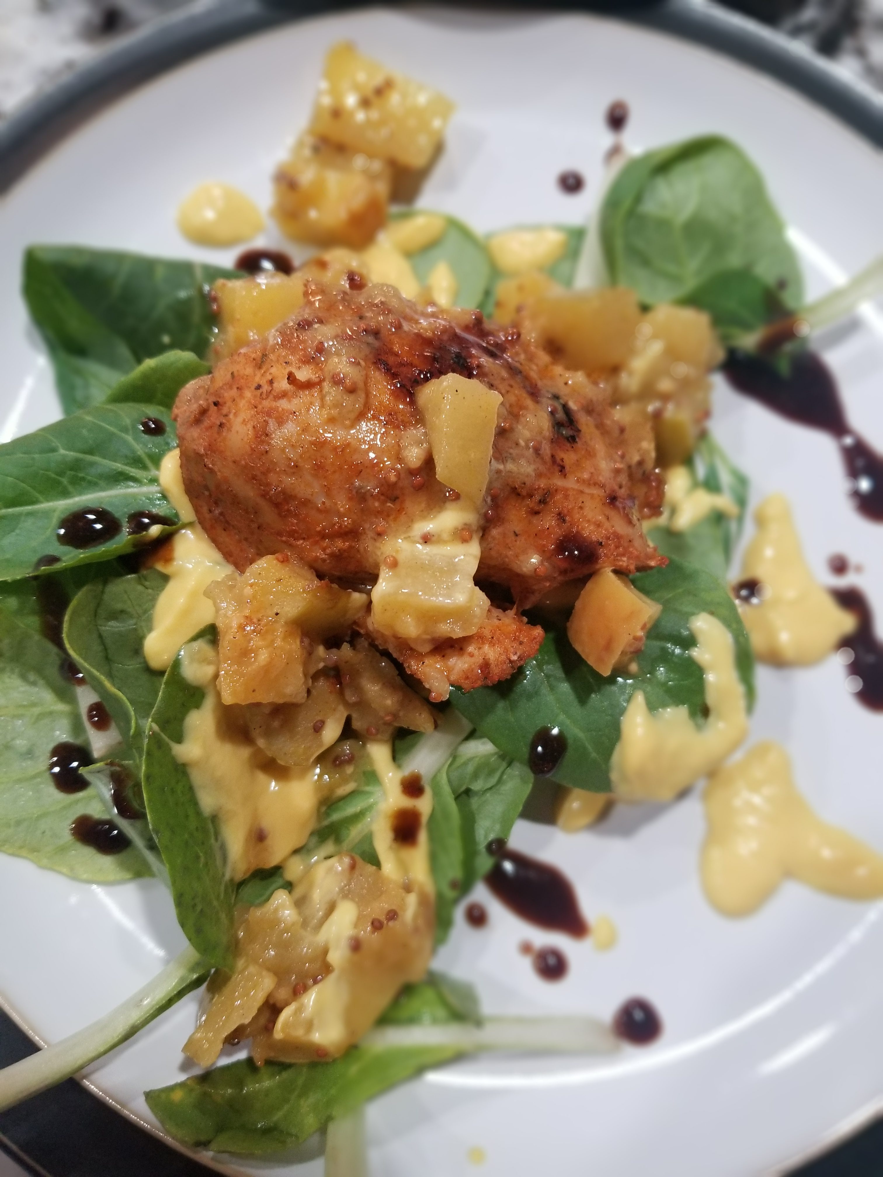 Sous Vide Chicken with apple chutney, orange cream and balsamic vinegar reduction served with baby boc choi.